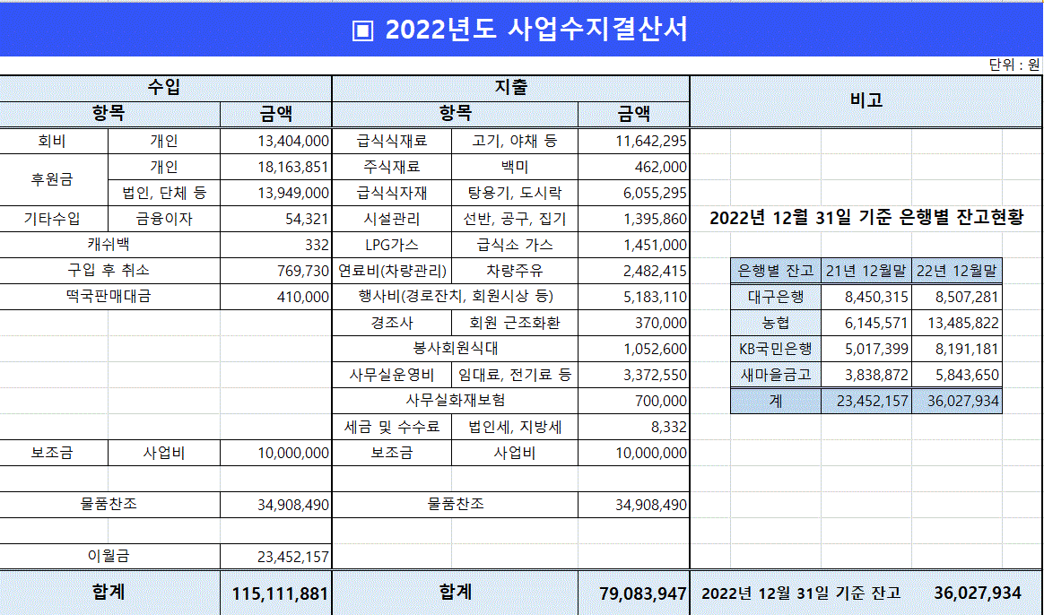 기관소개 설립이념 걸어온길 인사말 사람들 오시는길 사업소개 급식후원과 고충상담 정기공연과 나눔장터 경로잔치와 음악회 회원교육과 교류 참여하기 봉사하기 후원하기 봉사혜택 커뮤니티 공지사항 포토갤러리 사업계획서 예산 결산 및 감사보고서 후원의손길 연락하기 부패신고 기관소개 설립이념 걸어온길 인사말 사람들 오시는길 사업소개 급식후원과 고충상담 정기공연과 나눔장터 경로잔치와 음악회 회원교육과 교류 참여하기 봉사하기 후원하기 봉사혜택 커뮤니티 공지사항 포토갤러리 사업계획서 예산 결산 및 감사보고서 후원의손길 연락하기 부패신고 행복한 동행의 사업입니다. 행복한 동행의 사업입니다. 예산 결산 및 감사보고서 결산 및 감사보고서 2022년 사업수지결산서 2026-03-01 목록