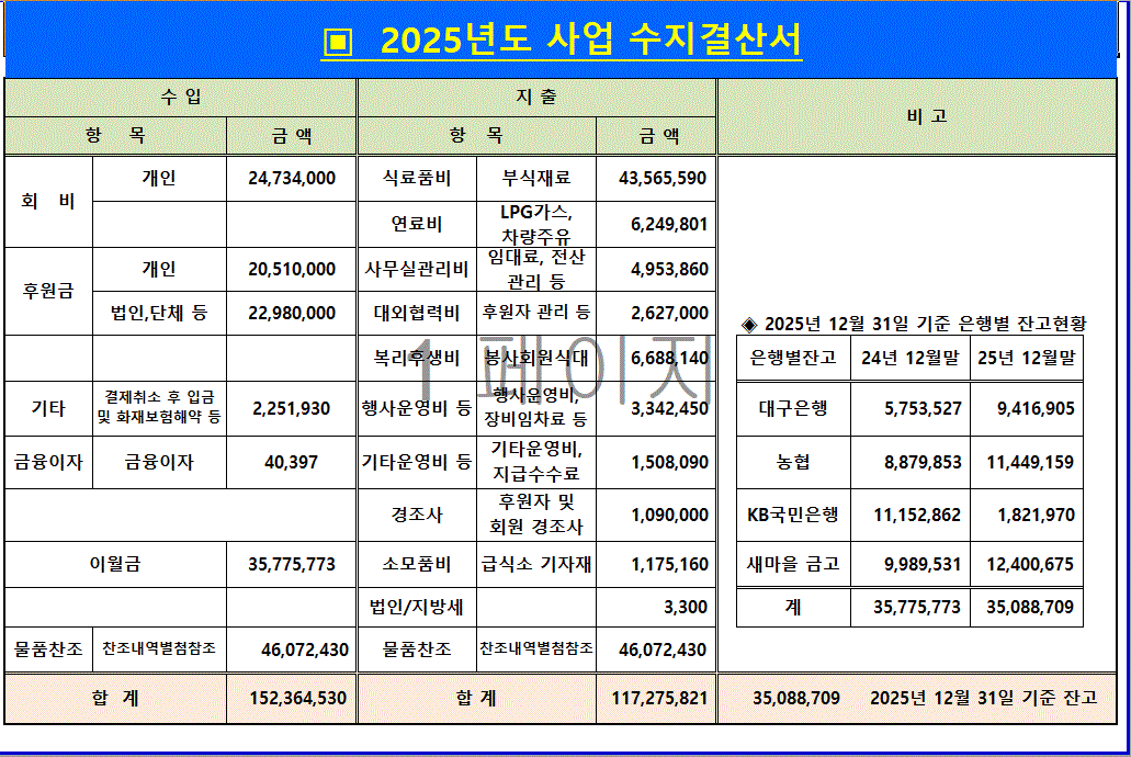 기관소개 설립이념 걸어온길 인사말 사람들 오시는길 사업소개 급식후원과 고충상담 정기공연과 나눔장터 경로잔치와 음악회 회원교육과 교류 참여하기 봉사하기 후원하기 봉사혜택 커뮤니티 공지사항 포토갤러리 사업계획서 예산 결산 및 감사보고서 후원의손길 연락하기 부패신고 기관소개 설립이념 걸어온길 인사말 사람들 오시는길 사업소개 급식후원과 고충상담 정기공연과 나눔장터 경로잔치와 음악회 회원교육과 교류 참여하기 봉사하기 후원하기 봉사혜택 커뮤니티 공지사항 포토갤러리 사업계획서 예산 결산 및 감사보고서 후원의손길 연락하기 부패신고 행복한 동행의 사업입니다. 행복한 동행의 사업입니다. 예산 결산 및 감사보고서 결산 및 감사보고서 2025년 사업수지결산서 2026-03-07 목록